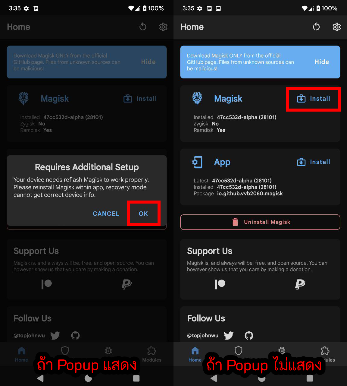 เมื่อเสร็จแล้วให้ Reboot System แล้วเข้าแอป Magisk อีกครั้งจะแสดงข้อความ “Requires Additional Setup” ให้กด OK หรือถ้าไม่แสดงให้กด Install ที่ Magisk